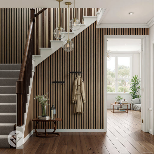 Inspired by classic wood wall panels, designed with a luxury, wrapped real wood veneer finish on the slats. The acoustic felt backing features a printed wood grain design, to create a solid wood panel effect.