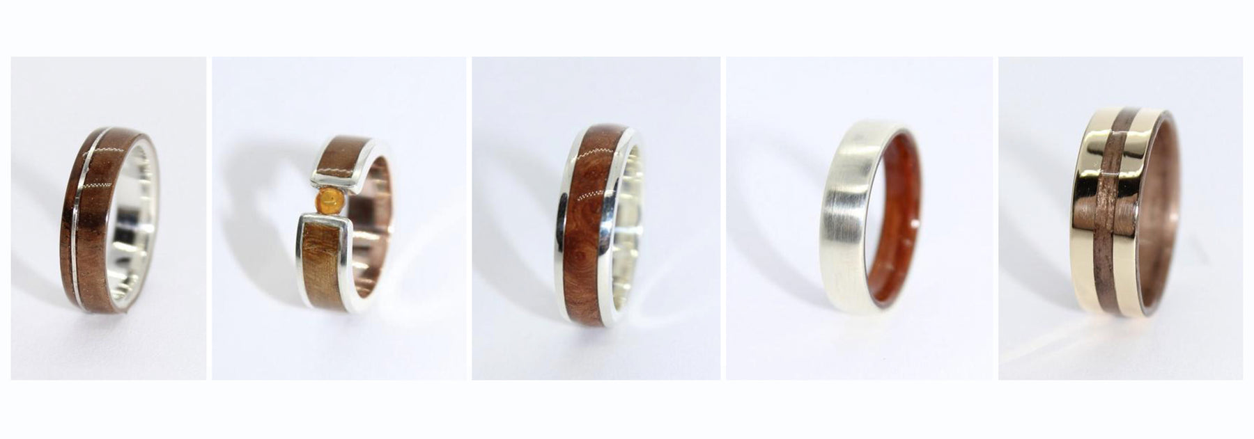 Many of his bentwood rings have an inner band which is made from a piece of wood veneer, carefully formed into a circle, with an outer band of metal, whilst others are predominantly made from metal with a wood veneer detailing.