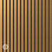 Each panel is finished with a metallic foil surface in carefully curated tones such as gold, aluminium and bronze. The surface has a gentle sheen and directional texture, creating a dynamic effect that responds beautifully to both natural and artificial light. Applied to black MDF slats and mounted on an acoustic felt backing, the result is a panel that delivers both visual presence and acoustic performance.