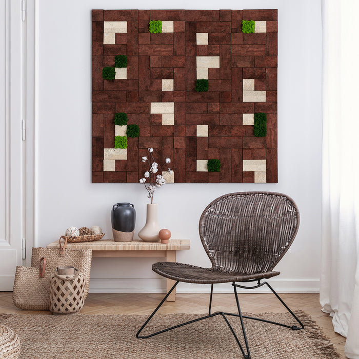 Step into a realm where passion meets craftsmanship, giving life to the Small Moss Square S. Meticulously designed to complement Cork Bricks 3D, Grand, and Korkstone Classic, this piece encapsulates the vibrancy of preserved natural moss entwined with the refined allure of cork. Imbue your surroundings with a touch of nature’s freshness and the enduring sophistication of cork.